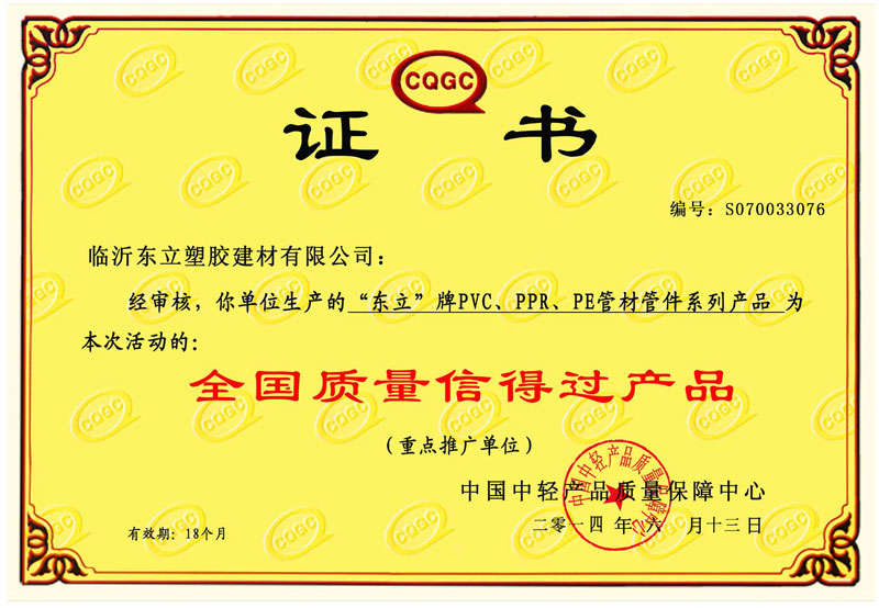 全國質(zhì)量信得過產(chǎn)品證書